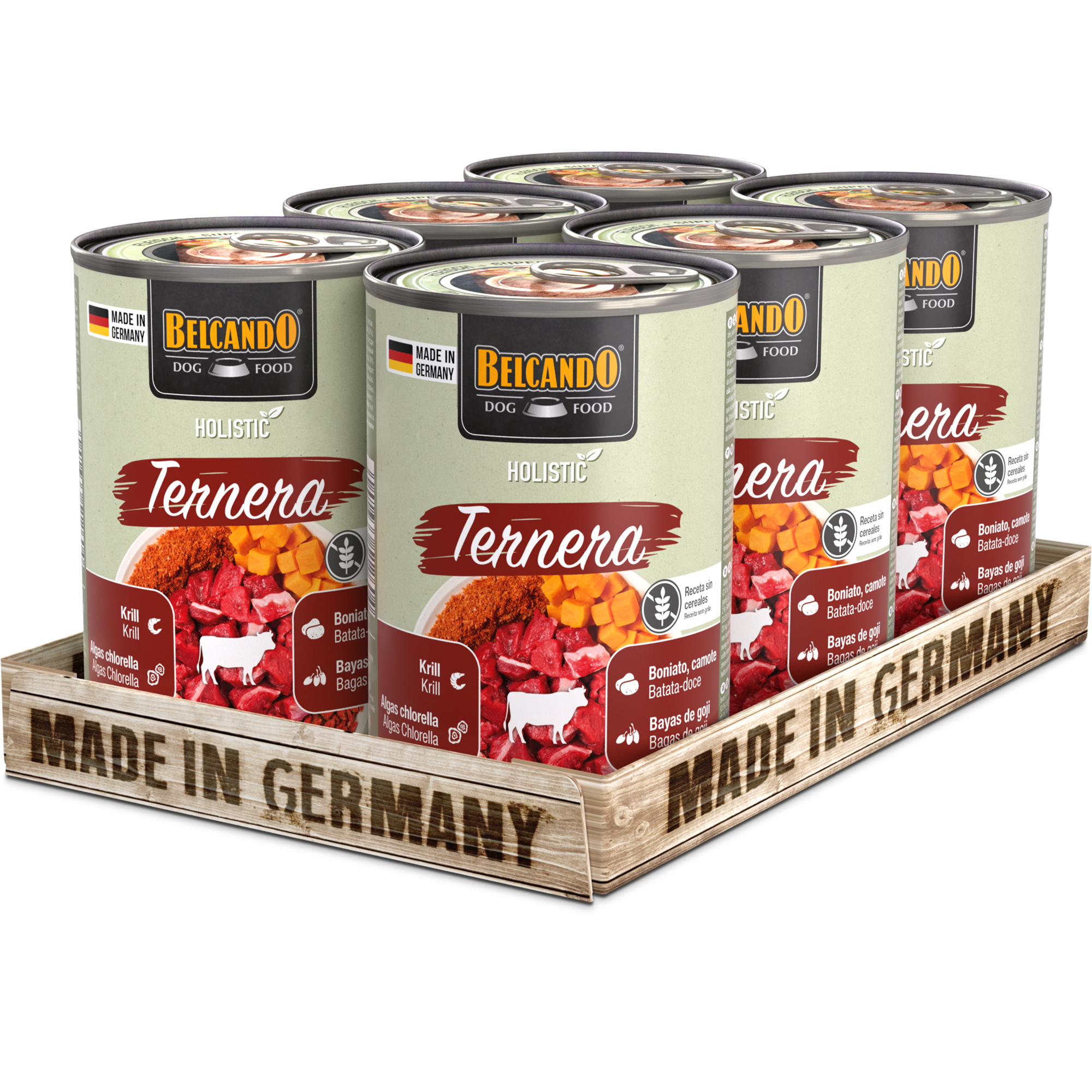 Composición Carne, corazón, pulmón, hígado y ubre de ternera (53 %); caldo de carne de ternera (37,4 %); batata o boniato (3 %); zooplancton marino (krill)*¹ (2,4 %); guisantes (2 %); minerales (1,1 %); bayas de goji*² (0,5 %); cáscaras de huevo*² (0,4 %); algas*² (Chlorella vulgaris) (0,2 %) *¹molido *²secado