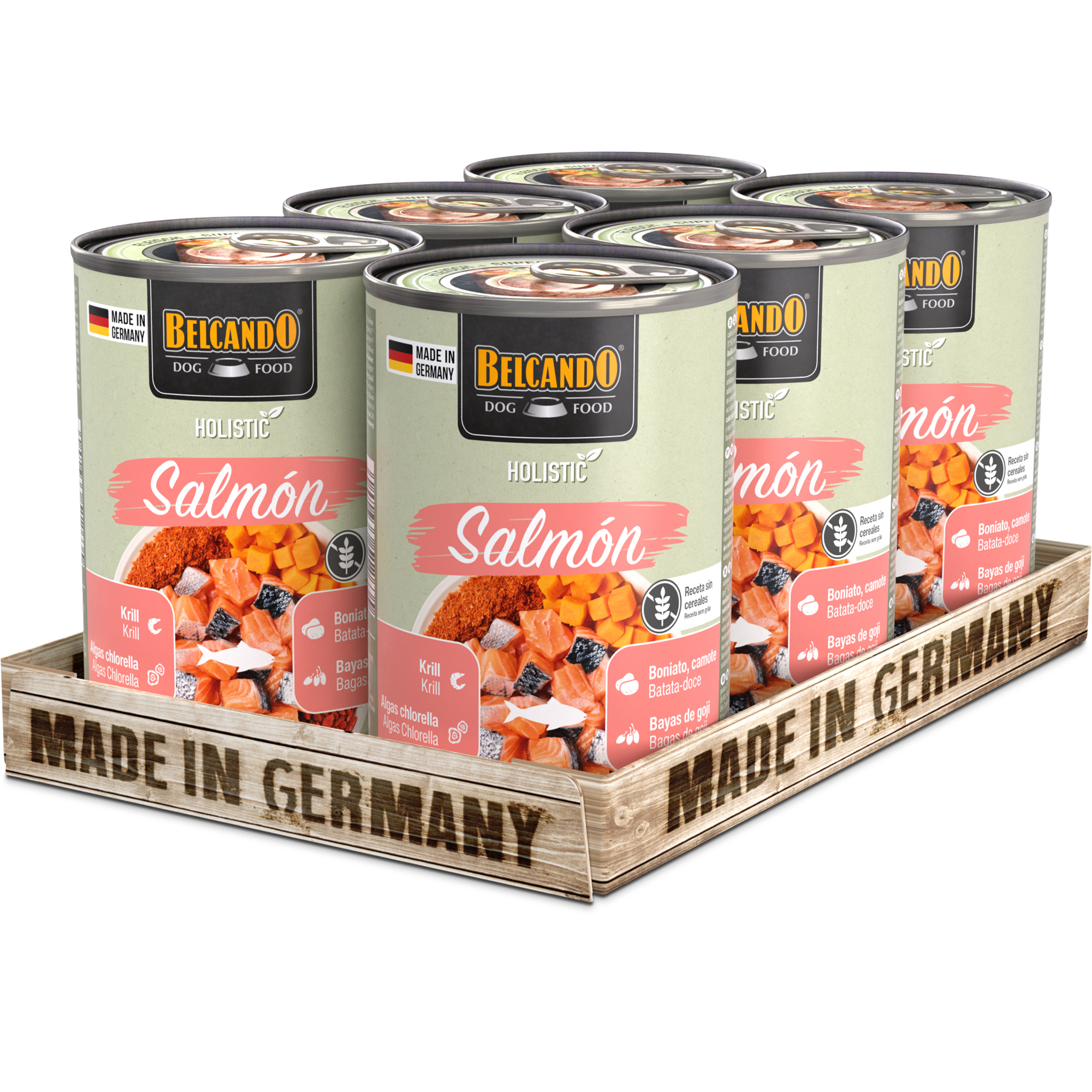 Al abrir la tapa, queda claro al instante: ¡aquí hay mucho más! Exquisito salmón con un extra de krill, cubierto con una capa de superalimentos especialmente deliciosa que habla por sí sola: jugosas bayas de goji, algas clorela, un potente alimento, y batatas irresistiblemente sabrosas, visiblemente frescas y repletas de nutrientes. Estos ingredientes son auténticas fuentes de energía, que aportan antioxidantes, carbohidratos de alta calidad, ácidos grasos omega-3, vitaminas y mucho más. Elegimos conscientemente ingredientes naturales cuidadosamente equilibrados y prescindimos de cereales, colorantes, saborizantes y conservantes artificiales. Para nosotros, una dieta holística significa más que solo nutrir el cuerpo de tu perro: también se trata de apoyar su bienestar y vitalidad.
