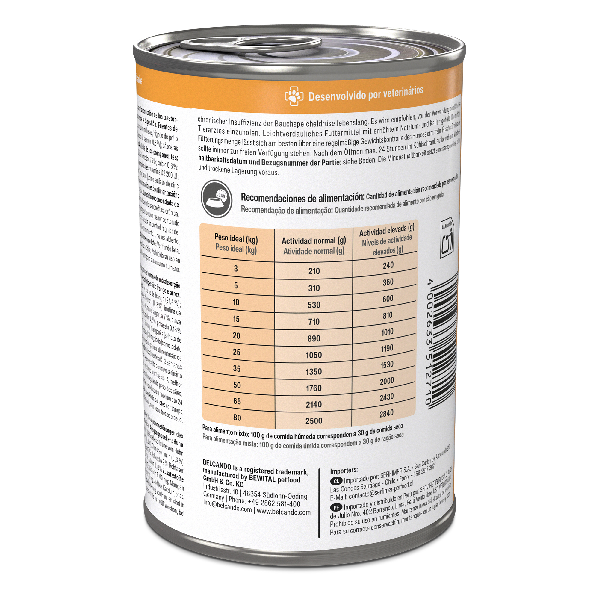 Los valores promedio para la alimentación de un perro se indican en la tabla. Duración recomendada de alimentación: Inicialmente hasta 12 semanas, y toda la vida en caso de insuficiencia pancreática crónica. Se recomienda consultar a un veterinario antes de utilizarlo. Pienso muy digestible con mayor contenido de sodio y potasio. La cantidad correcta de alimentación se determina a través de un control regular del peso del perro. Siempre debe haber agua fresca a disposición del animal. Una vez abierto, conservar en el frigorífico durante un máximo de 24 horas.
