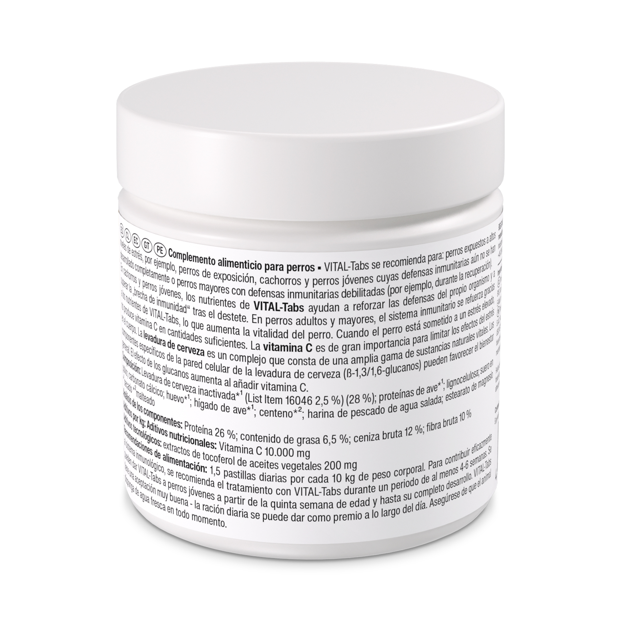 1,5 pastillas diarias por cada 10 kg de peso corporal. Para contribuir eficazmente al sistema inmunológico, se recomienda el tratamiento con VITAL-Tabs durante un periodo de al menos 4-6 semanas. Se pueden dar VITAL-Tabs a perros jóvenes a partir de la quinta semana de edad y hasta su completo desarrollo. VITAL-Tabs tiene una aceptación muy buena - la ración diaria se puede dar como premio a lo largo del día. Asegúrese de que el animal disponga de agua fresca en todo momento.