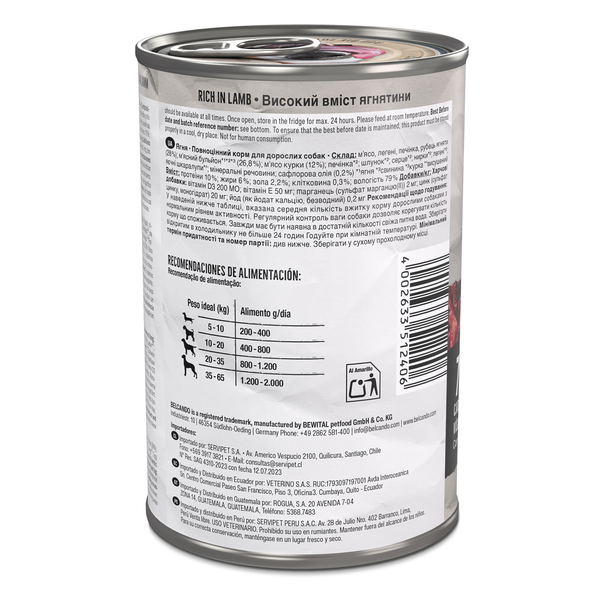 Composición Carne, pulmón, hígado y panza de cordero (28 %); caldo de carne*¹*²*³ (26,8 %); carne de pollo (12 %); hígado*²; estómago*²; corazón*²; riñones*²; pulmón*²; cáscaras de huevo*⁴; minerales; aceite de cártamo (0,2 %) *¹cordero *²cerdo *³pollo *⁴secado