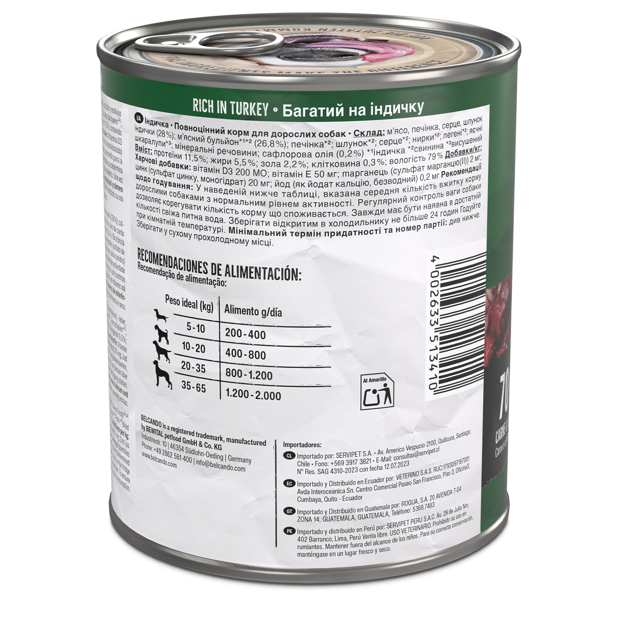 Composición Carne, hígado, corazón y mollejas de pavo (28 %); caldo de carne*¹*² (26,8 %); hígado*²; estómago*²; corazón*²; riñones*²; pulmón*²; cáscaras de huevo*³; minerales; aceite de cártamo (0,2 %) *¹pavo *²cerdo *³secado