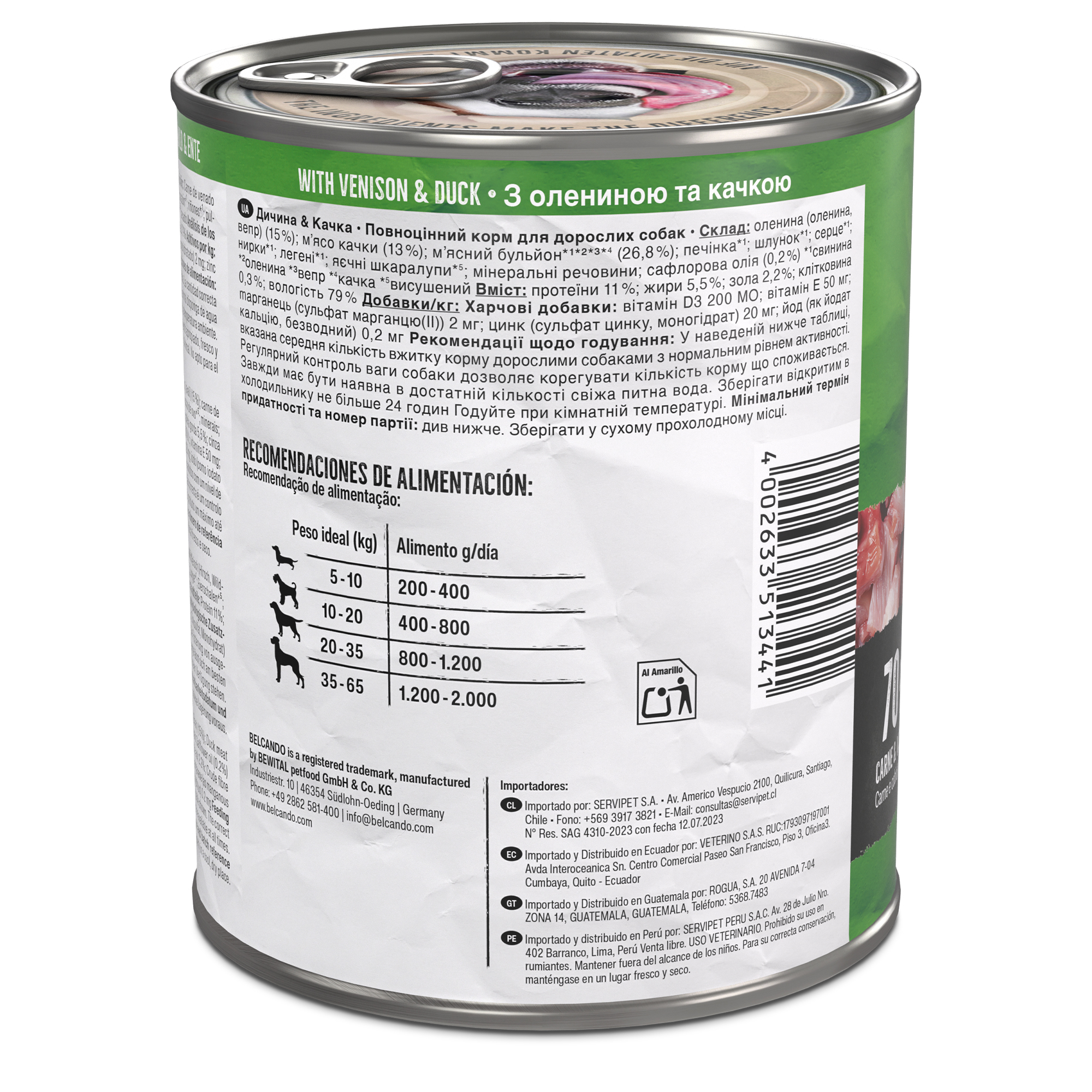 Los valores promedio para la alimentación de un perro adulto con actividad normal se indican en la tabla. La cantidad correcta de alimentación se determina a través de un control regular del peso del perro. Siempre debe haber agua fresca a disposición del animal. Una vez abierto, conservar en el frigorífico durante un máximo de 24 horas. Alimentar a temperatura ambiente.